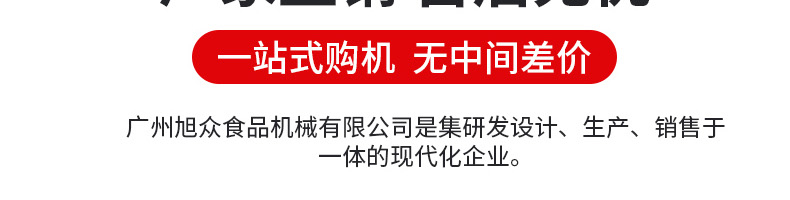 廣州旭眾食品機械有限公司是一家集科研開發(fā),生產(chǎn)設計,營銷服務為一體的現(xiàn)代化生產(chǎn)企業(yè)。現(xiàn)代化生產(chǎn)車間,精湛制造技術,所產(chǎn)機械歷經(jīng)市場重重考驗,不斷贏得海內(nèi)外客戶的贊譽。