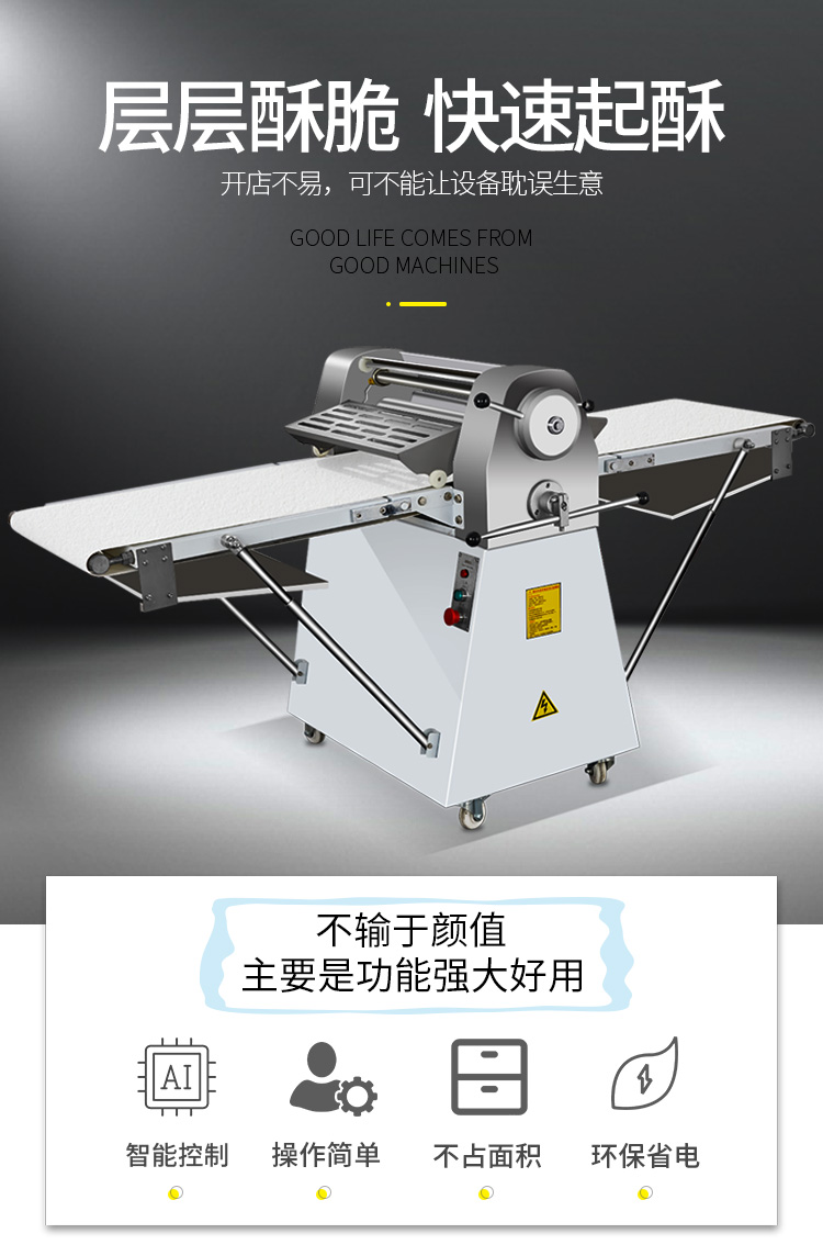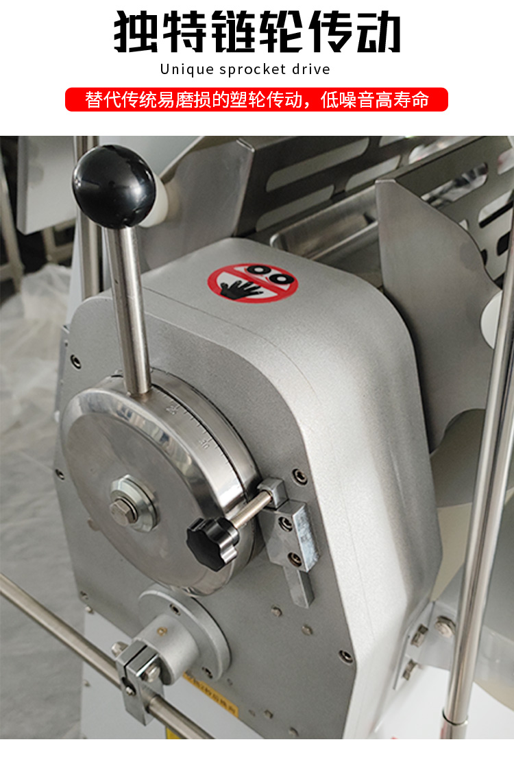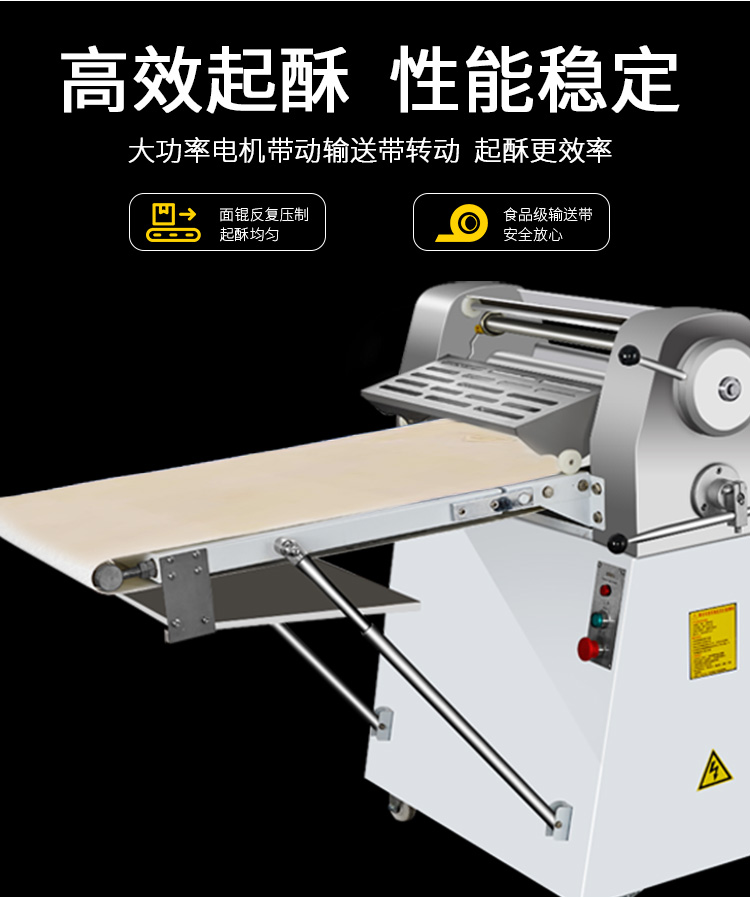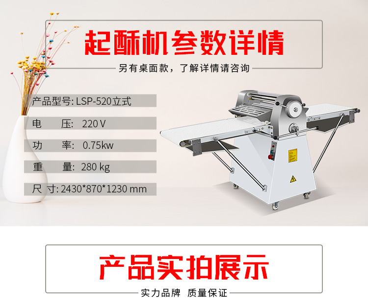 LSP-520酥皮機(jī),采用獨(dú)特的鏈輪傳動(dòng)替代了傳統(tǒng)易磨損的塑輪傳動(dòng),低噪音,高壽命滾輪經(jīng)過特殊工藝處理,不粘面,不易刮傷適用于手撕面包、羊角面包、蛋撻、老婆餅、千層餅,等酥皮類食品,也可用于輾壓面團(tuán)。