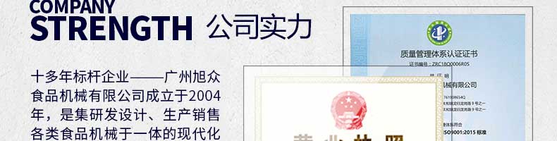 廣州旭眾食品機械有限公司是一家集科研開發,生產設計,營銷服務為一體的現代化生產企業。現代化生產車間,精湛制造技術,所產機械歷經市場重重考驗,不斷贏得海內外客戶的贊譽。