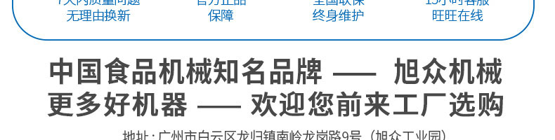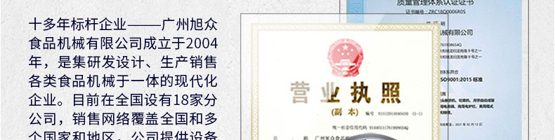 廣州旭眾食品機(jī)械有限公司是一家集科研開發(fā),生產(chǎn)設(shè)計(jì),營(yíng)銷服務(wù)為一體的現(xiàn)代化生產(chǎn)企業(yè)。現(xiàn)代化生產(chǎn)車間,精湛制造技術(shù),所產(chǎn)機(jī)械歷經(jīng)市場(chǎng)重重考驗(yàn),不斷贏得海內(nèi)外客戶的贊譽(yù)。