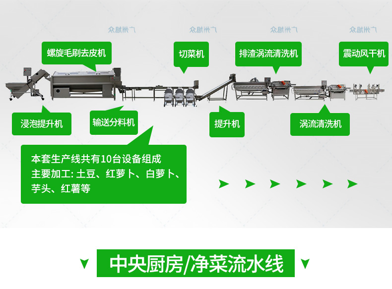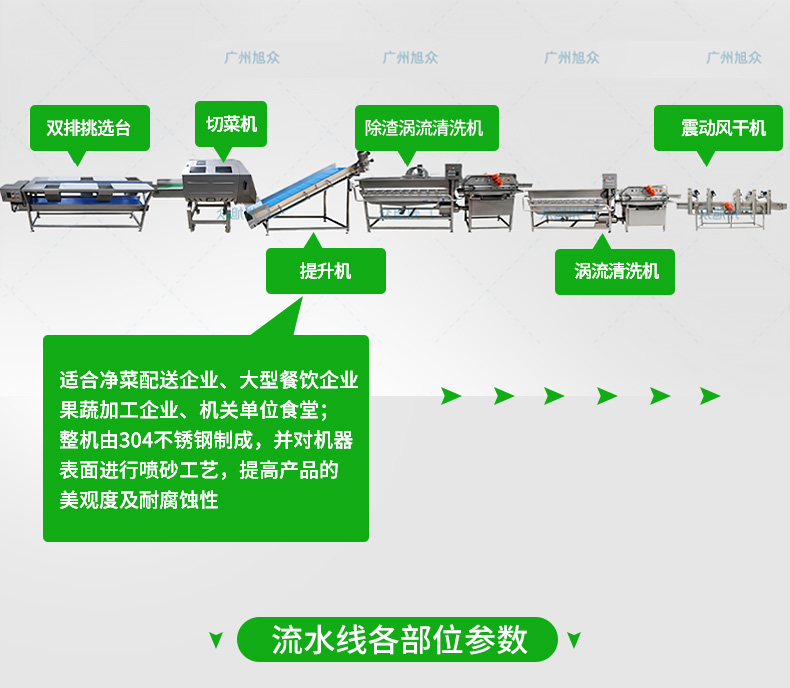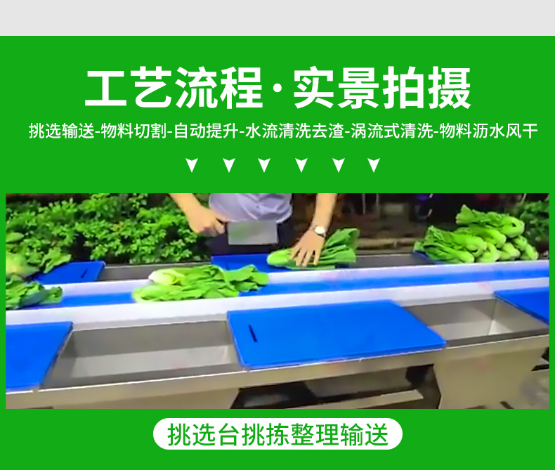 全自動大型葉菜清洗線,自動化程度高、整線設計合理、節約人工降低生產成本、外形美觀大方。主要用于葉菜加工,整線自動化凈菜生產此線將切割、清洗、風干設備連接成線,適合芹菜、韭菜菠菜、大白菜高麗菜、大蔥等葉菜類蔬菜加工生產