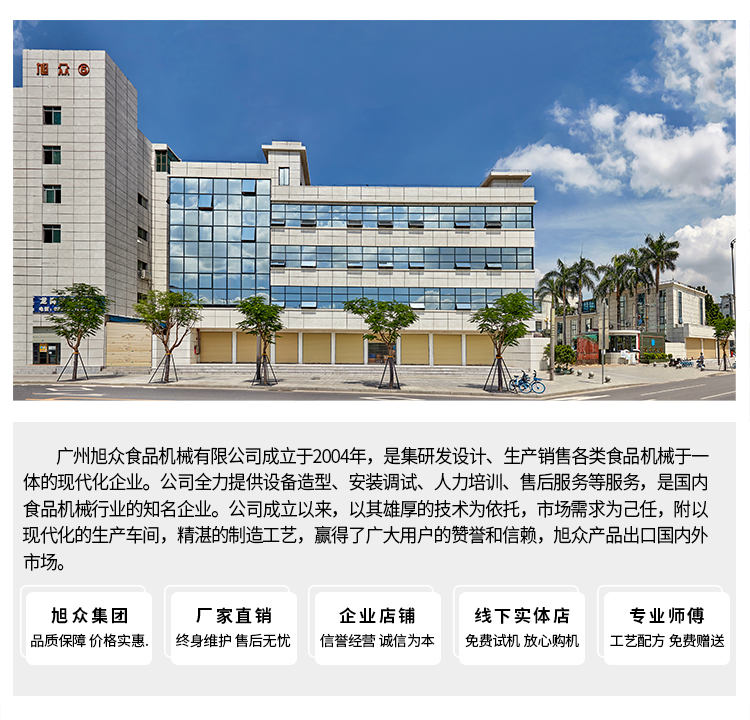 廣州旭眾食品機(jī)械有限公司是一家集科研開發(fā),生產(chǎn)設(shè)計(jì),營(yíng)銷服務(wù)為一體的現(xiàn)代化生產(chǎn)企業(yè)。現(xiàn)代化生產(chǎn)車間,精湛制造技術(shù),所產(chǎn)機(jī)械歷經(jīng)市場(chǎng)重重考驗(yàn),不斷贏得海內(nèi)外客戶的贊譽(yù)。