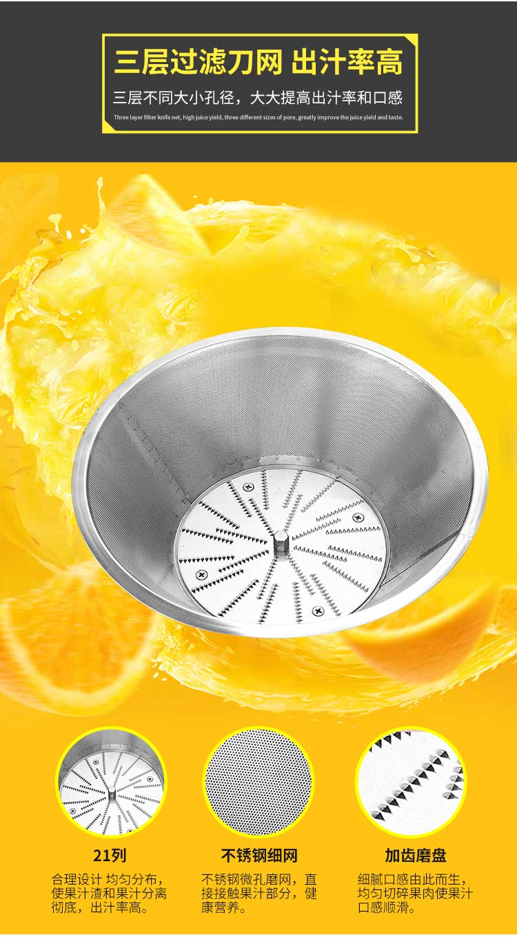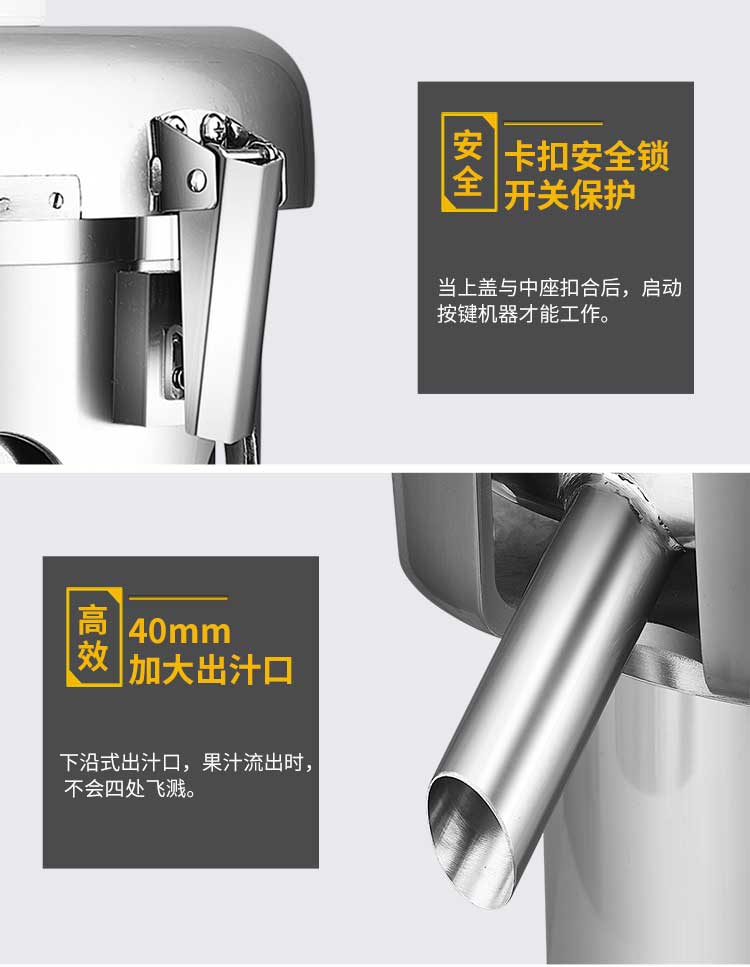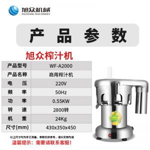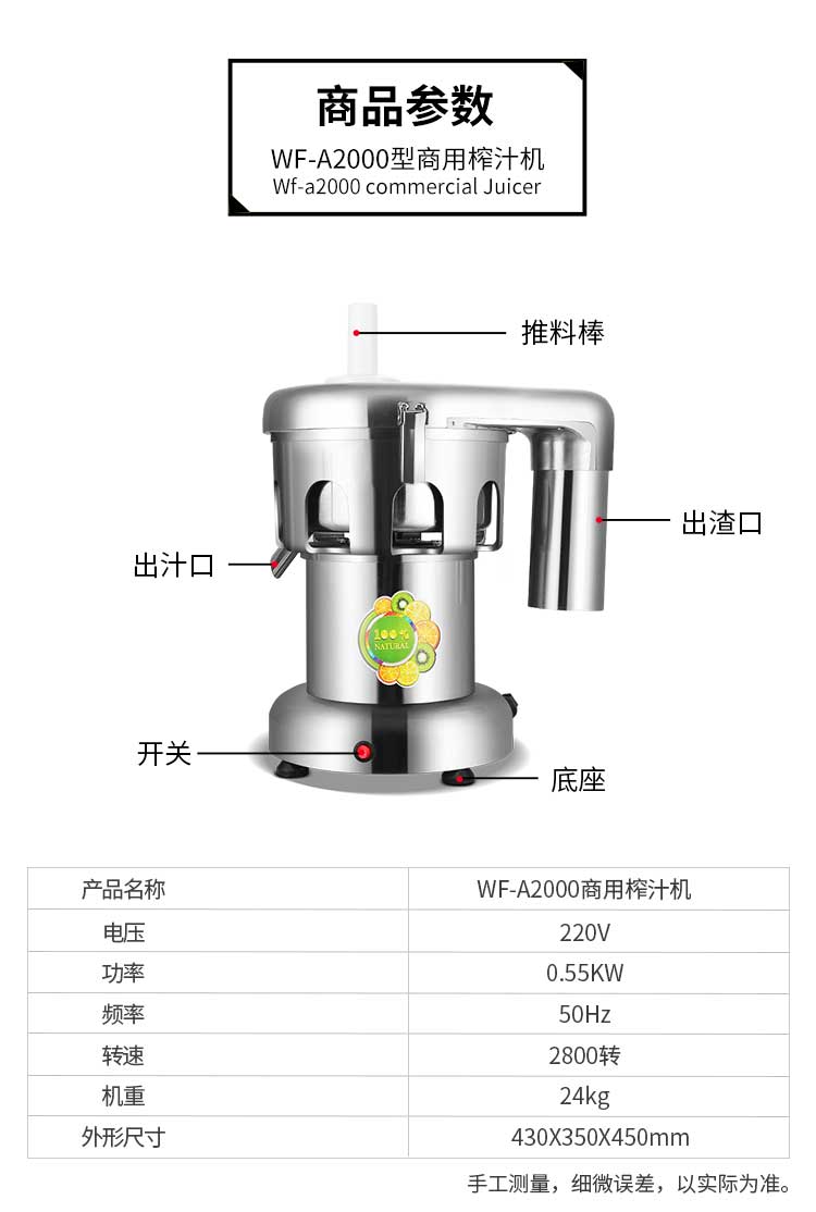 WF-A2000商用榨汁機,該機所榨出的汁液是現榨的原汁,不含任何人為的防腐劑、穩定劑、色素、香精、水等,凡與榨汁接觸的原件均為不銹鋼和無毒塑料聚丙烯和 A.B.S,食用安全。