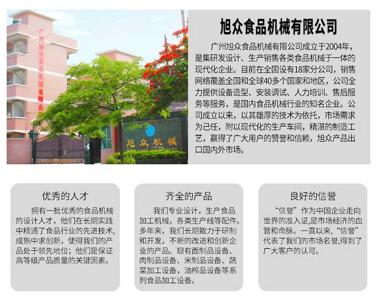 廣州旭眾食品機械有限公司是一家集科研開發,生產設計,營銷服務為一體的現代化生產企業。現代化生產車間,精湛制造技術,所產機械歷經市場重重考驗,不斷贏得海內外客戶的贊譽。