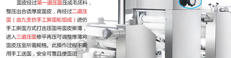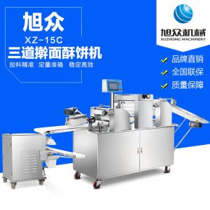 xz-15c三道搟面酥餅機,仿手工制作面食產品的機型,占地面積小,重量輕,運用搟面杖壓面和打擊面團,以保證高面筋性和面帶的密度,并綜合考慮面食的口感而研發。可生產東北糖酥餅,東北大香酥餅,蘇式月餅,芝麻餅,鮮花餅,老婆餅。購機免費提供工藝技術