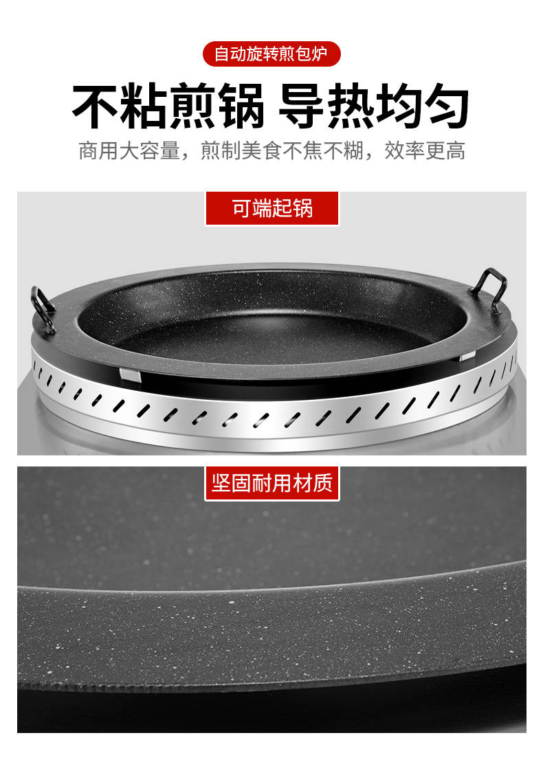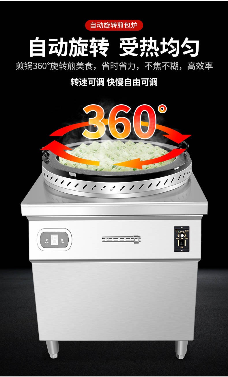 XZ-WSKB自動旋轉煎包爐,煎制各種美食鍋在手,各種煎包煎餃煎美食,輕松搞定。自動旋轉、受熱均勻煎鍋360°旋轉煎美食,省時省力,不焦不糊,高效率轉速可調快慢自由可調。