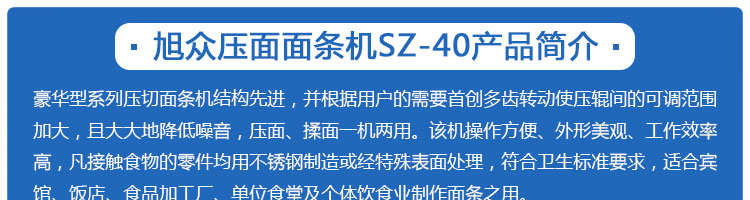 SZ40、SZ60壓面面條機系列,本機壓面、揉面一機兩用,用于制作面條、云吞皮、糕點、面點等食品,生產的產品韌性大、耐煮、不易斷,適合于賓館、飯店、食堂、面包廠及各類面點加工單位或個體商戶使用。