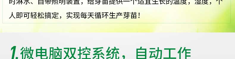 芽苗機系列,全自動芽苗機:智能化一生產安全無公害的芽苗,智能控溫、定時淋水、自帶照明裝置,給芽苗提供一個適宜生長的溫度,濕度,個人即可輕松搞定,實現每天循環生產芽苗!