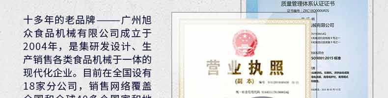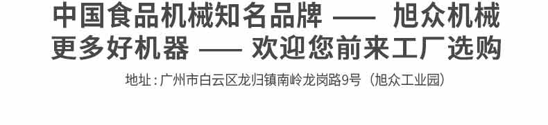 廣州旭眾食品機械有限公司是一家集科研開發,生產設計,營銷服務為一體的現代化生產企業。現代化生產車間,精湛制造技術,所產機械歷經市場重重考驗,不斷贏得海內外客戶的贊譽。